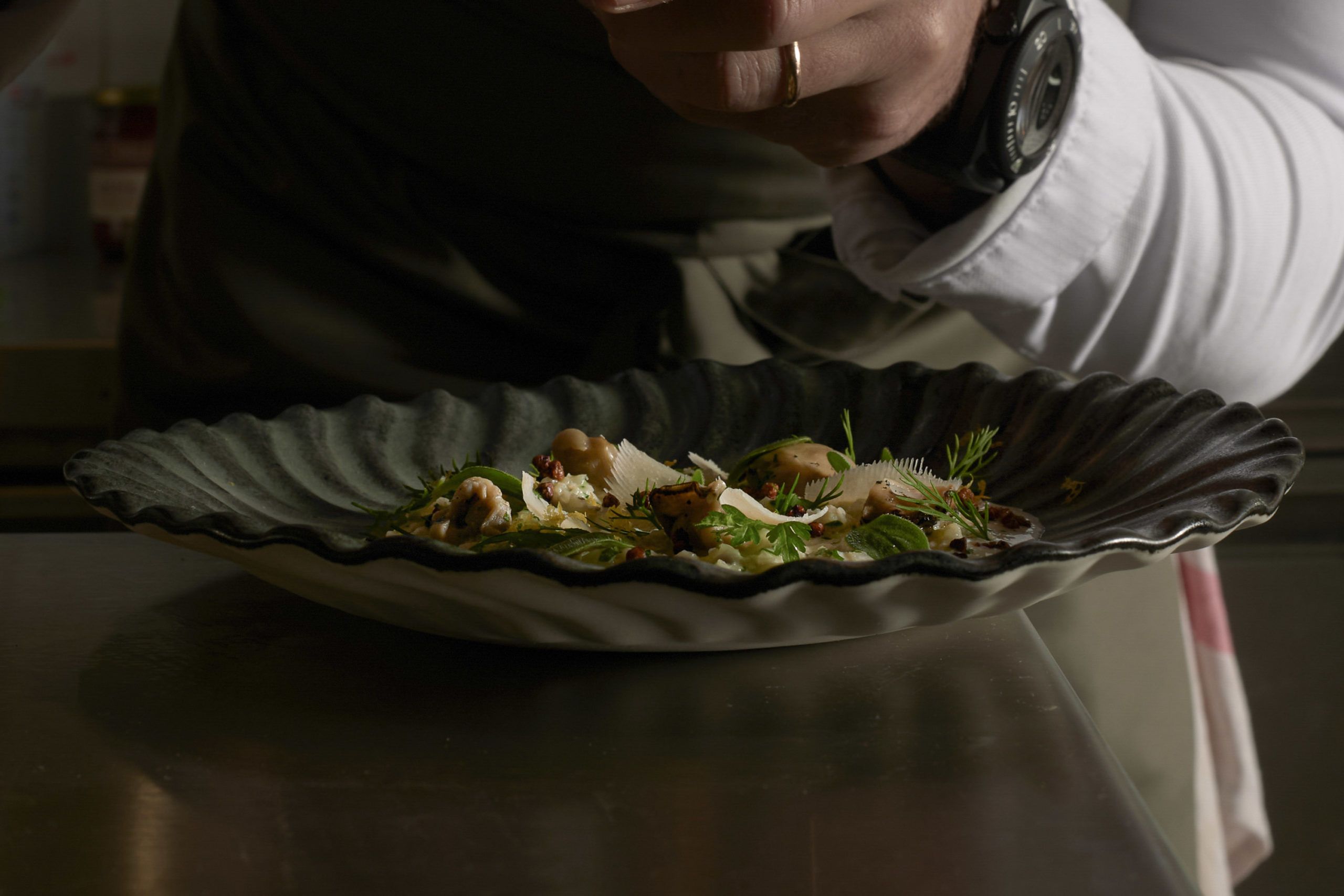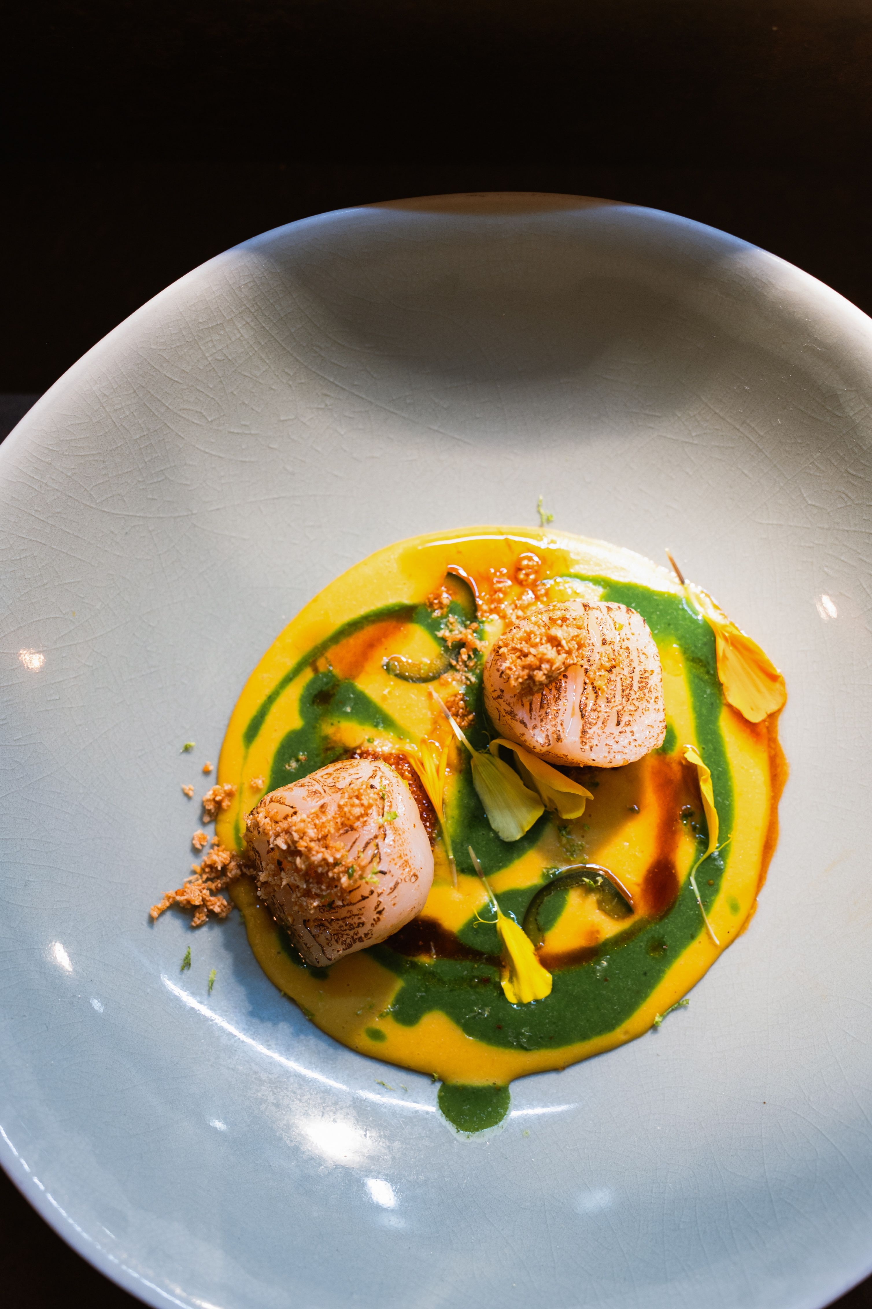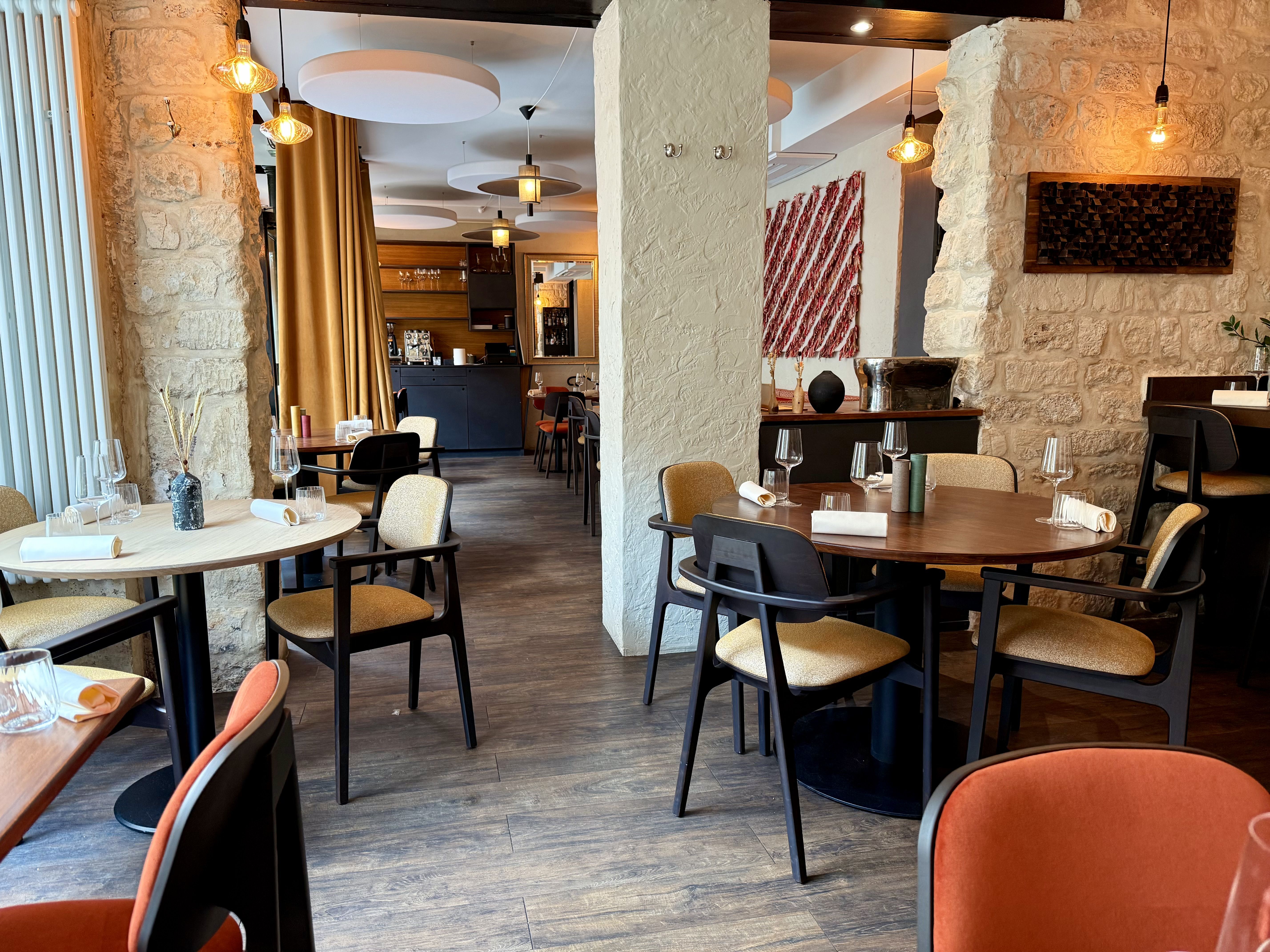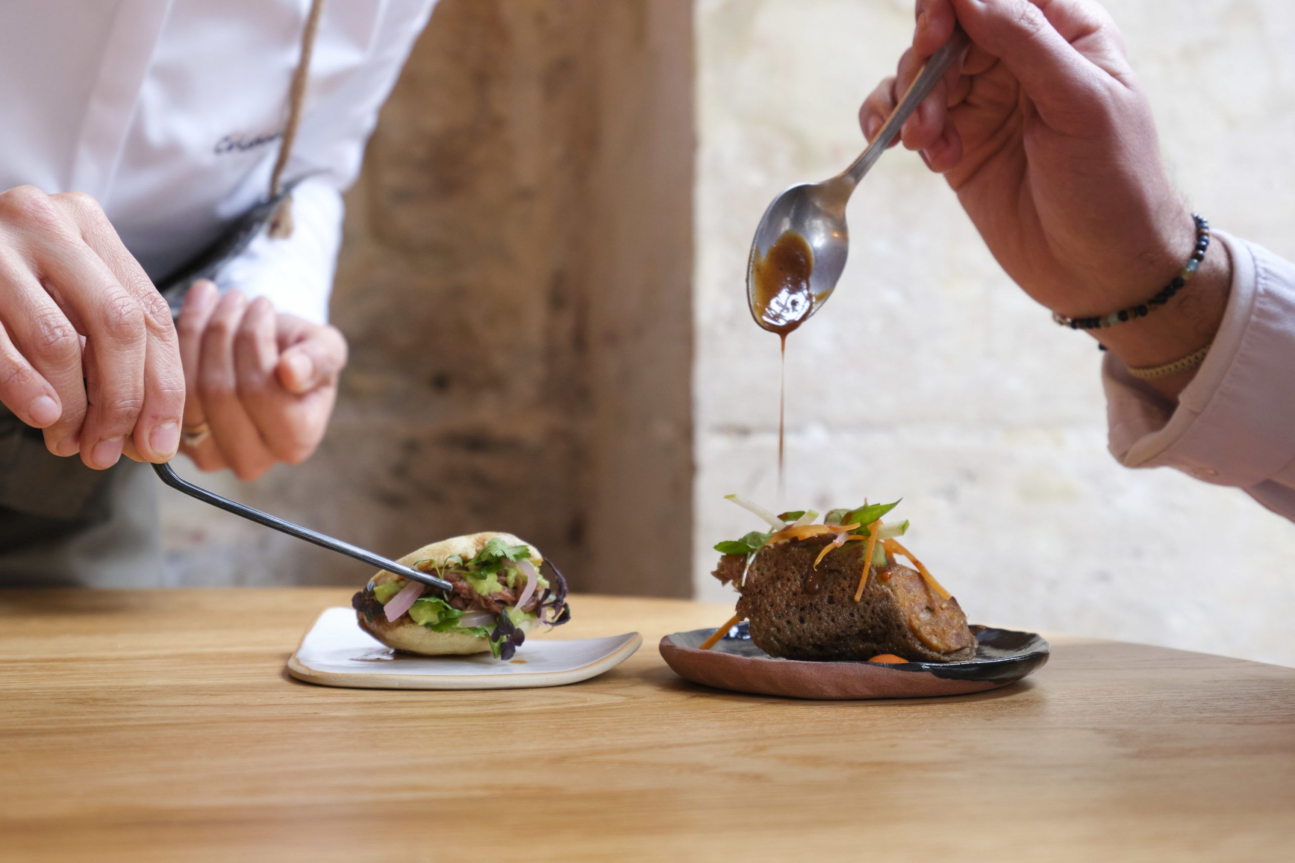 En espagnol, « ambos » signifie « les deux ». Pas besoin de vous faire un dessin, on parle de Cristina Chomet Tejeda et Pierre Chomet, « les deux » au restaurant comme à la maison. En face du Sénat et du Jardin du Luxembourg, ils accueillent leurs convives chez eux, sérieux comme un débat dans l’hémicycle, légers comme une promenade entre les arbres et les joueurs d’échec. Les matières sont brutes, pierre, brique et bois. Le lieu a été rendu à ses origines, dans ce quartier historique de Paris, mais dans un esprit contemporain. Le soleil s’invite presque toute la journée à travers la baie vitrée, éclairant les murs couleur crème. La hauteur sous plafond donne du souffle, les plateaux des tables en chêne clair contrastent avec le sol foncé. À droite, la cuisine s’ouvre sur un comptoir en L inversé où quelques privilégiés peuvent s’asseoir, devant le passe. La table des chef·fes, sur réservation, on la trouve au sous-sol, en empruntant un escalier, promesse de plongée dans un univers à part. Cave voûtée, secret le mieux gardé de nombreuses demeures au coeur de Paris, éclairage tamisé, carreaux de terre cuite, grande table d’hôte pour 6 ou 8 personnes, on mange et l’on boit au milieu des casiers à bouteilles. Du plaisir à tous les étages.