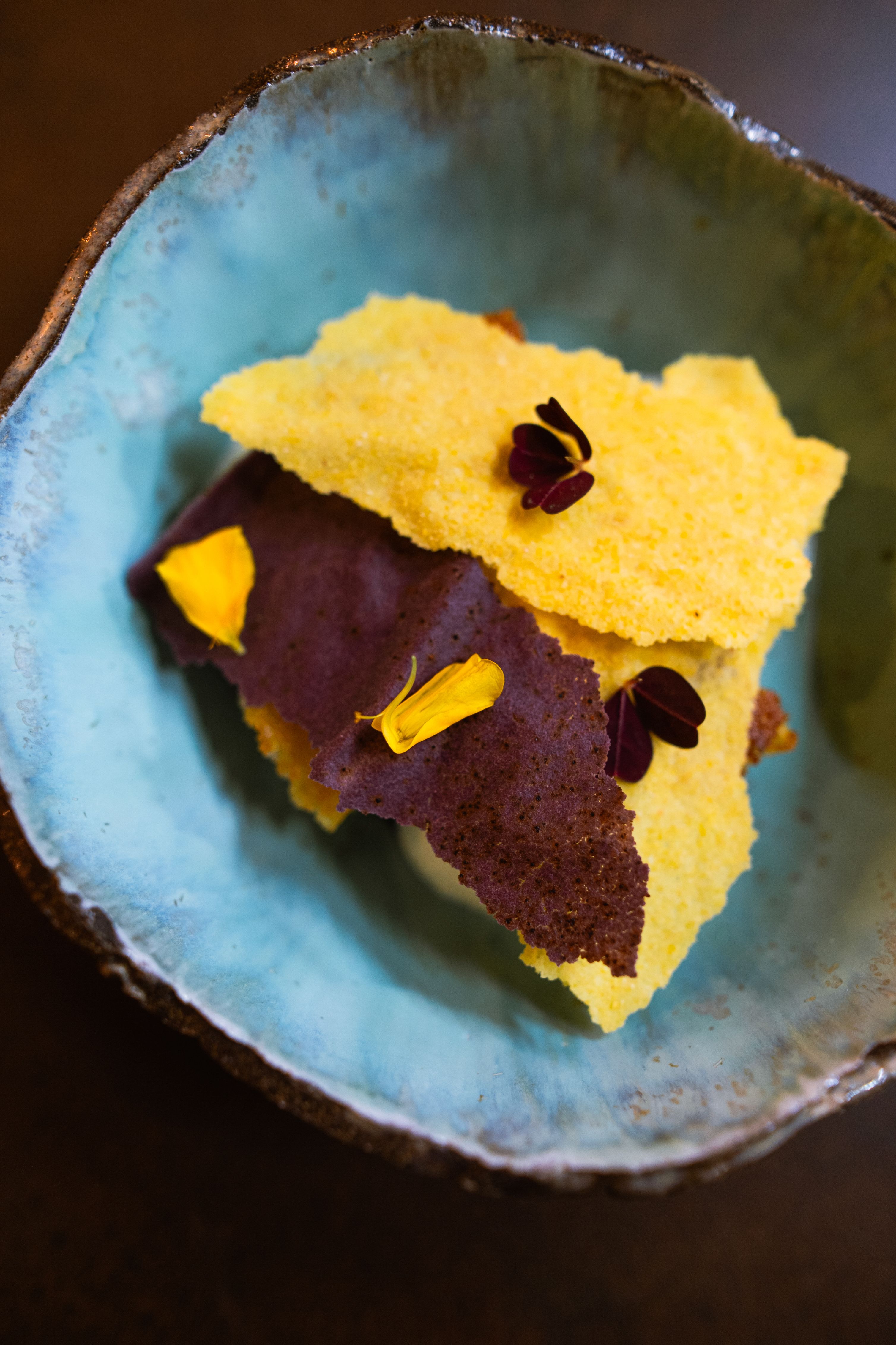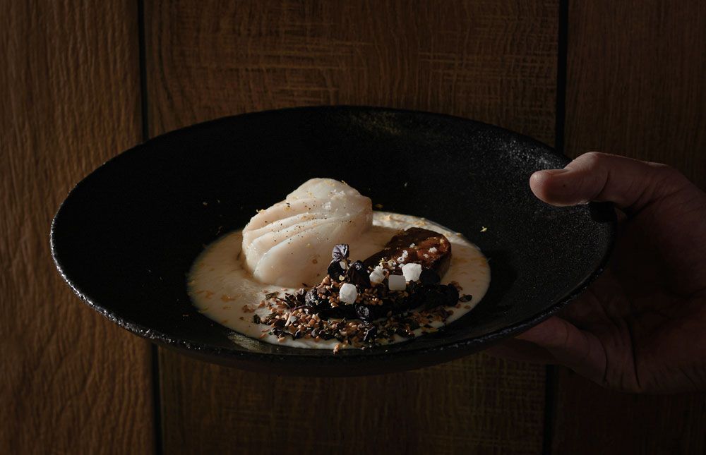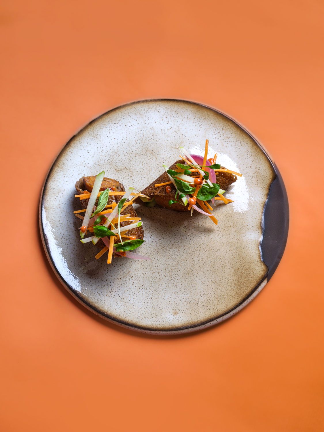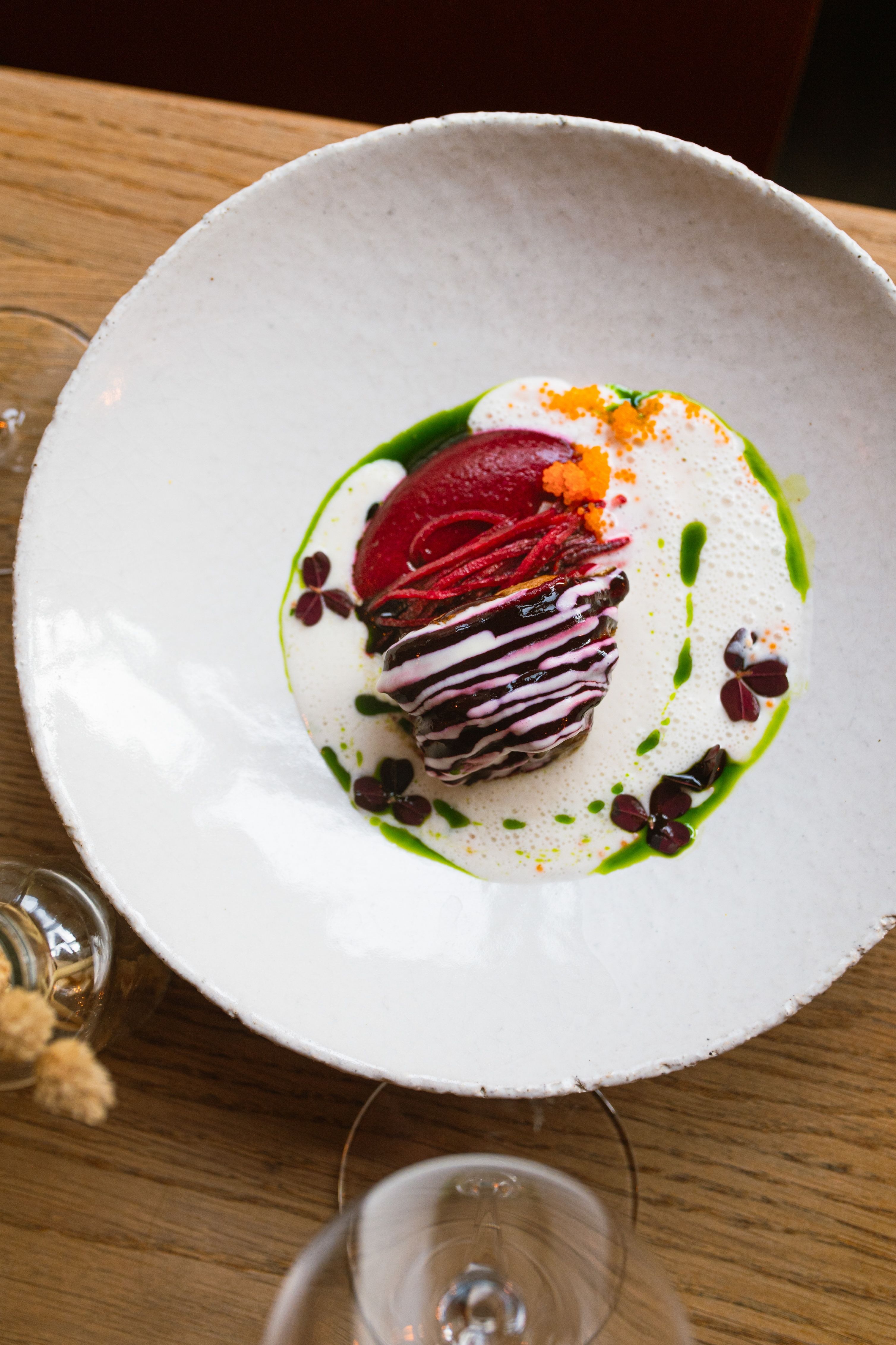 En espagnol, « ambos » signifie « les deux ». Pas besoin de vous faire un dessin, on parle de Cristina Chomet Tejeda et Pierre Chomet, « les deux » au restaurant comme à la maison. En face du Sénat et du Jardin du Luxembourg, ils accueillent leurs convives chez eux, sérieux comme un débat dans l’hémicycle, légers comme une promenade entre les arbres et les joueurs d’échec. Les matières sont brutes, pierre, brique et bois. Le lieu a été rendu à ses origines, dans ce quartier historique de Paris, mais dans un esprit contemporain. Le soleil s’invite presque toute la journée à travers la baie vitrée, éclairant les murs couleur crème. La hauteur sous plafond donne du souffle, les plateaux des tables en chêne clair contrastent avec le sol foncé. À droite, la cuisine s’ouvre sur un comptoir en L inversé où quelques privilégiés peuvent s’asseoir, devant le passe. La table des chef·fes, sur réservation, on la trouve au sous-sol, en empruntant un escalier, promesse de plongée dans un univers à part. Cave voûtée, secret le mieux gardé de nombreuses demeures au coeur de Paris, éclairage tamisé, carreaux de terre cuite, grande table d’hôte pour 6 ou 8 personnes, on mange et l’on boit au milieu des casiers à bouteilles. Du plaisir à tous les étages.